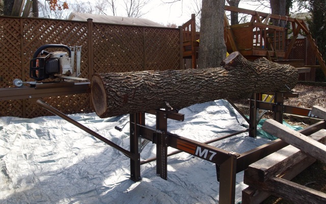 First of three logs delivered, two from Great Grandma and one from Grandma. The last of the batch will be project wood, the tree was damaged in an ice storm when small so had a large 'L' at about the 9' point in the trunk.