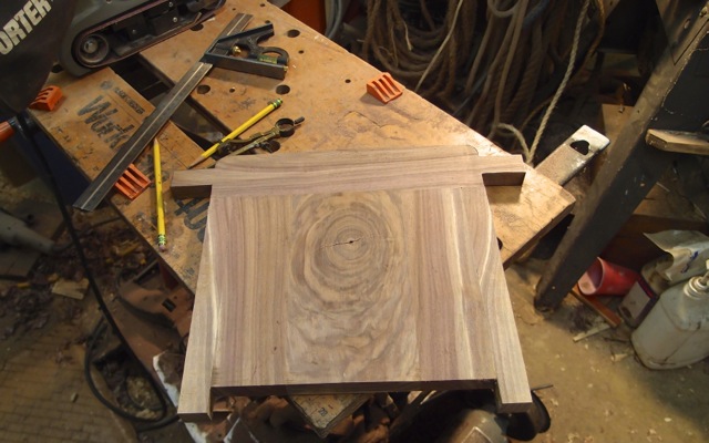 After looking over the available lumber I decided to make the sides 'plain' and put one slice of knot in the center of the seat and another in the center of the back. The boards were just shy of being wide enough so they had to be joined. Probably worked better anyway, there was a good bit of cupping and other irregularities.